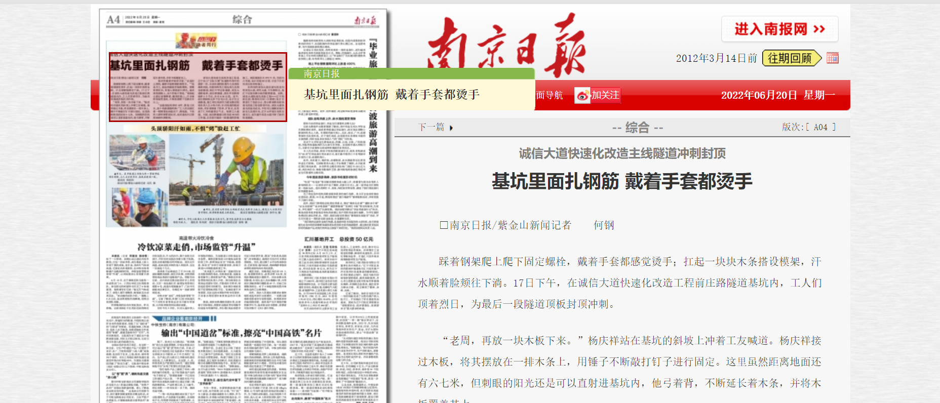 6月20日(rì),南(nán)京日(rì)報刊發了題爲《誠信大(dà)道快(kuài)速化改造主線隧道沖刺封頂基坑裡(lǐ)面紮鋼筋 戴着手套都(dōu)燙手》的文章(zhāng)。報道中,圖文并茂,生(shēng)動形象地呈現了同力建設一線工(gōng)人(rén)戰高溫、冒酷暑堅守崗位的工(gōng)作(zuò)情景,真切樸實多角度展現了江蘇省建勞動者的精神面貌和風(fēng)采。報道全文如(rú)下: